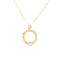 Χρυσό κολιέ 14 Καρατίων με κρεμαστό σε σχήμα κύκλου λουστρέ φινιρίσματος με λευκές πέτρες, που συγκρατείται από μονόπετρο ζιργκόν Swarovski ® λευκού χρώματος .