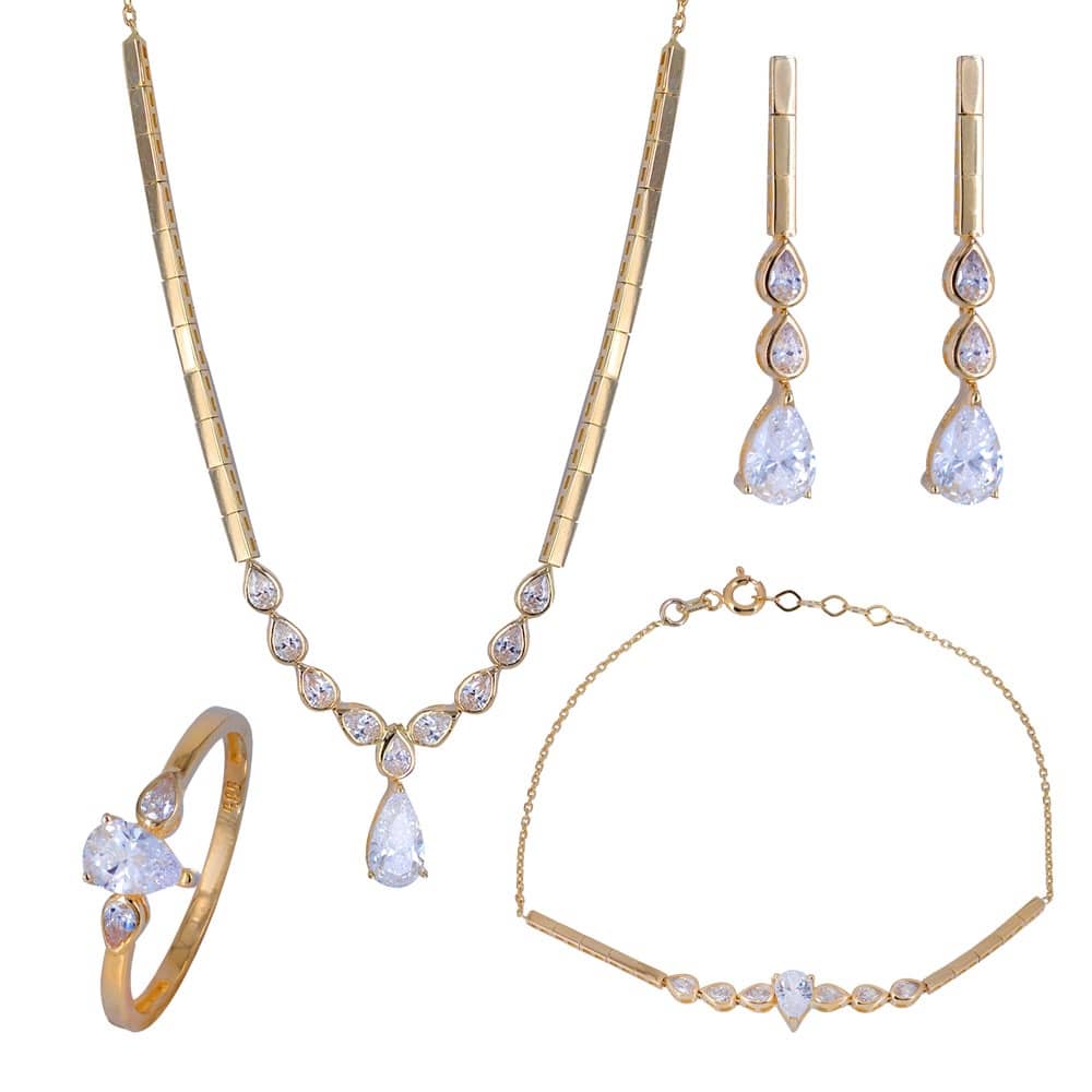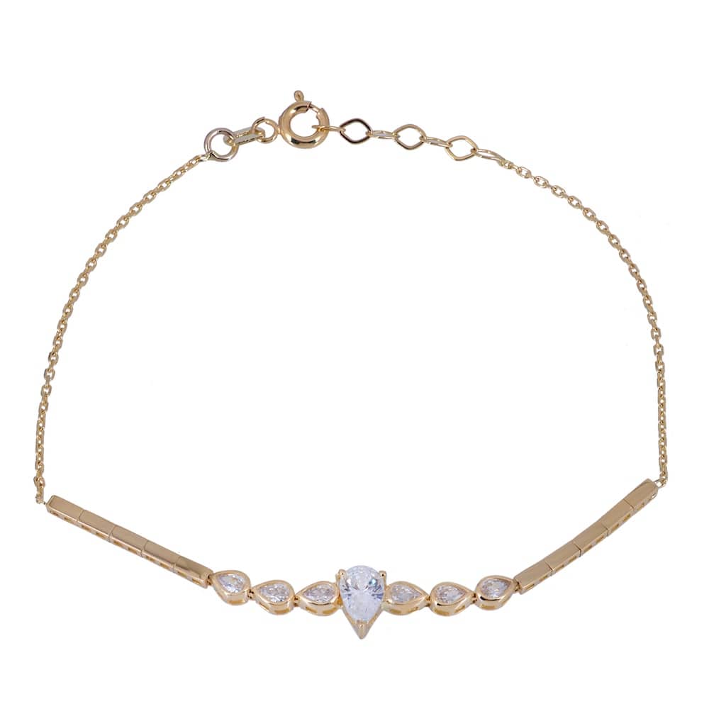 Xρυσό βραχιόλι 14 Καρατίων διακοσμημένο από λουστρέ ορθογώνια σχέδια και μία κεντρική πέτρα ζιργκόν Swarovski σε σχήμα δάκρυ που περιτρυγυρίζεται από 3 μικρότερες πέτρες ζιργκόν Swarovski σε κάθε μεριά.