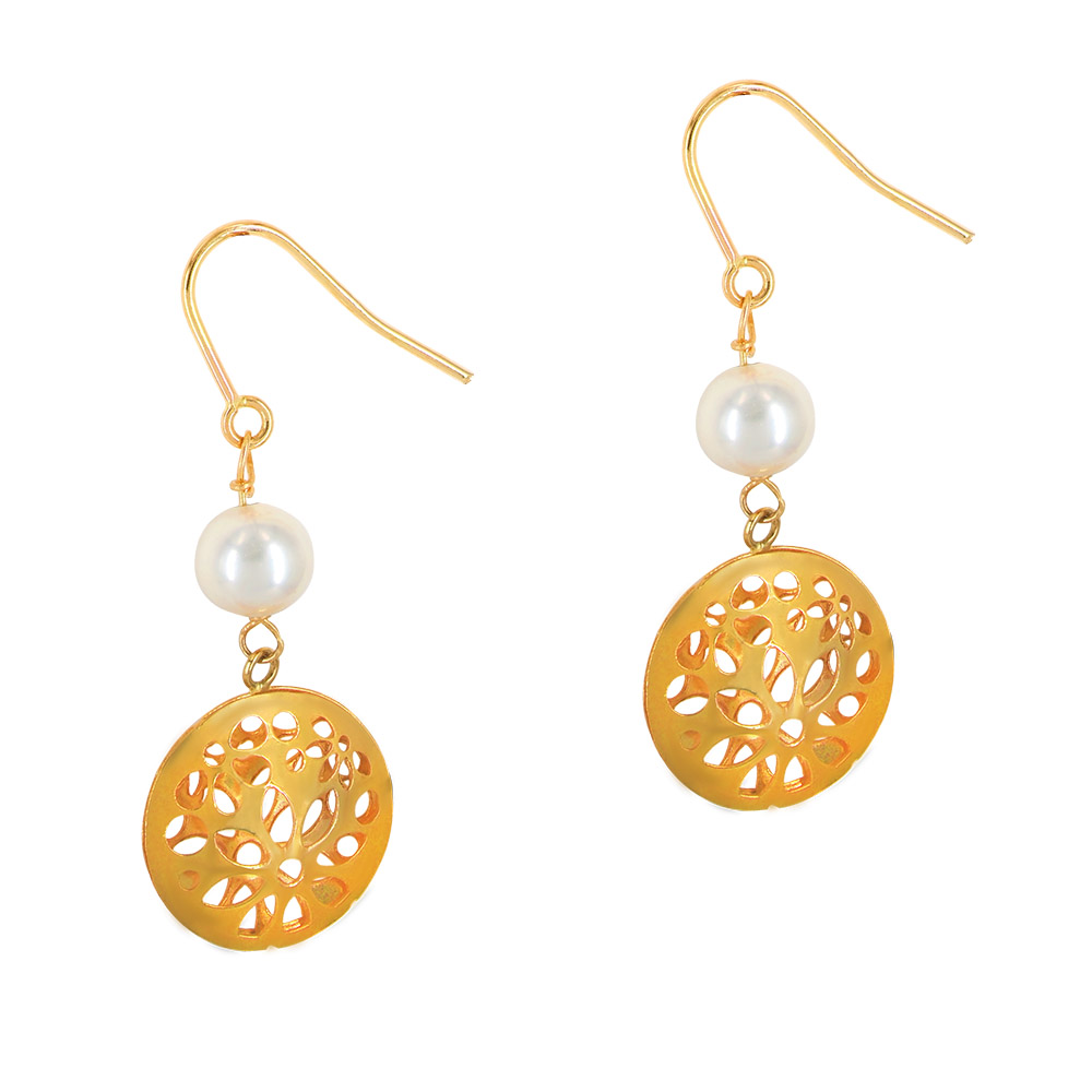 Χρυσά  σκουλαρίκια κρεμαστά, στρογγυλά με πέρλα 14 Καρατίων.
