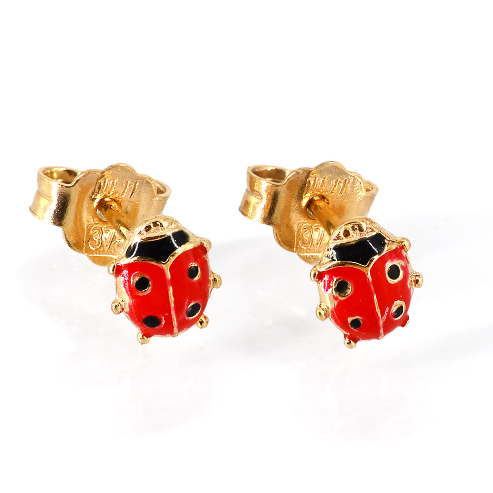 Χρυσά σκουλαρίκια καρφωτά 9 Καρατίων με σχέδιο πασχαλίτσα, σε κίτρινο χρώμα με κόκκινο και μαύρο σμάλτο στο μοτίφ.