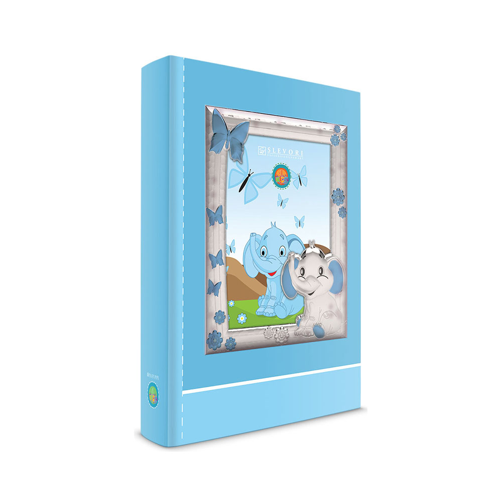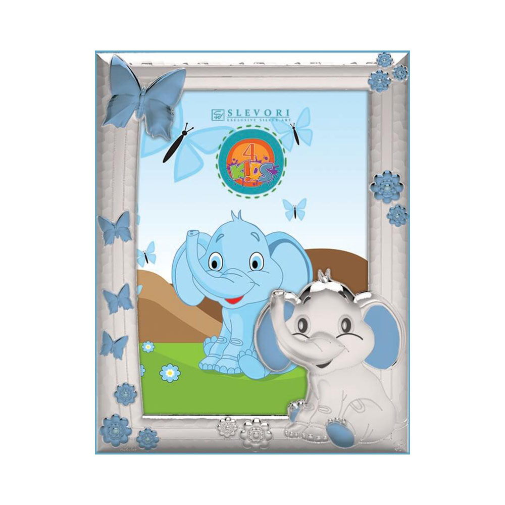 Ασημένια παιδική κορνίζα Slevori, με διακομητικό ελεφαντάκι και πεταλούδα, σε σιέλ χρώμα.