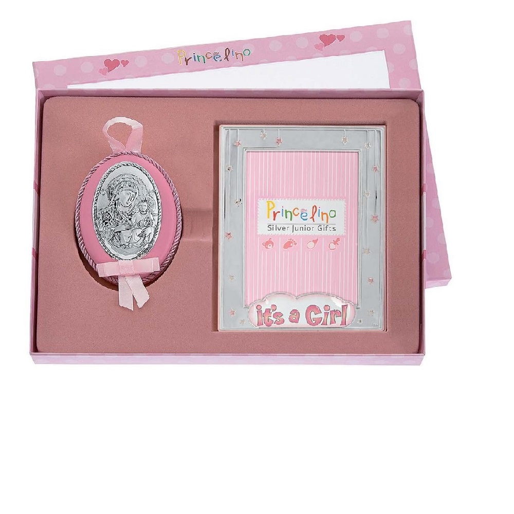 Ασημένιο παιδικό σετ 925 με κορνίζα σε σιέλ απόχρωση για αγόρι και εικόνα κούνιας Παναγία και Χριστός.