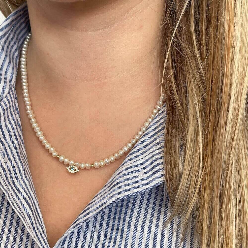 Κολιέ με λευκά μαργαριτάρια γλυκού νερού Fresh Water Pearl διαμέτρου 3,5 έως 4,0 χιλιοστών σε σχήμα Round (στρόγγυλο) ποιότητας ΑΑΑ. Στο κέντρο του υπάρχει 1 μενταγιόν ματάκι με ζιρκόν από χρυσό 14 καρατίων καθώς και 2 χρυσές μπίλιες 14 καρατίων διαμέτρου 2,2 χιλιοστών. Διαθέτει επίσης χρυσό κούμπωμα ασφαλείας 14 καρατίων. Είναι δεμένο με ειδικό ατσαλόσυρμα υψηλής αντοχής σε κίτρινο χρωματισμό. Το συνολικό του μήκος είναι 43 – 44 εκατοστά, όμως μπορείτε να το παραγγείλετε σε όποιο μήκος επιθυμείτε.