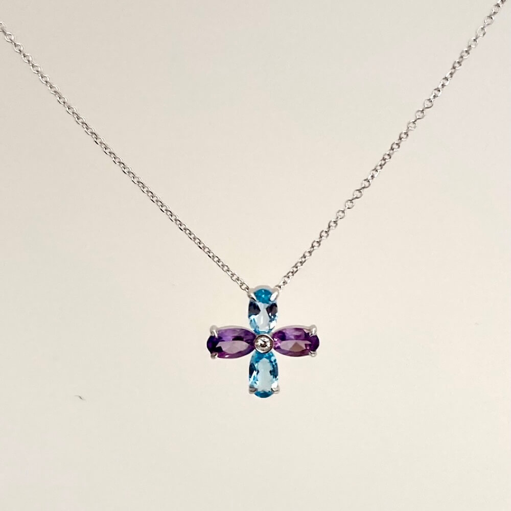 Λευκόχρυσο κολιέ 18 Καρατίων με μπλέ τοπάζ, αμέθυστο και διαμάντι.