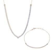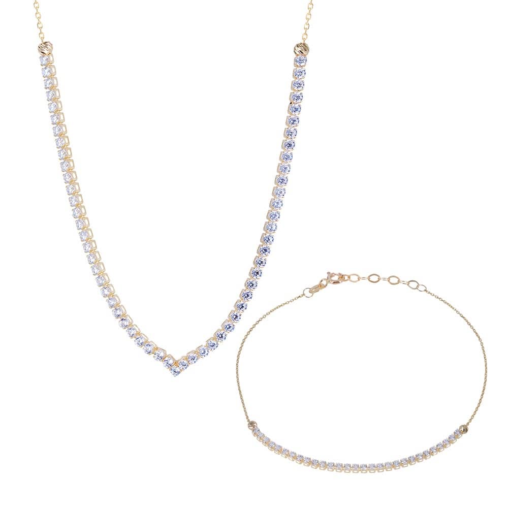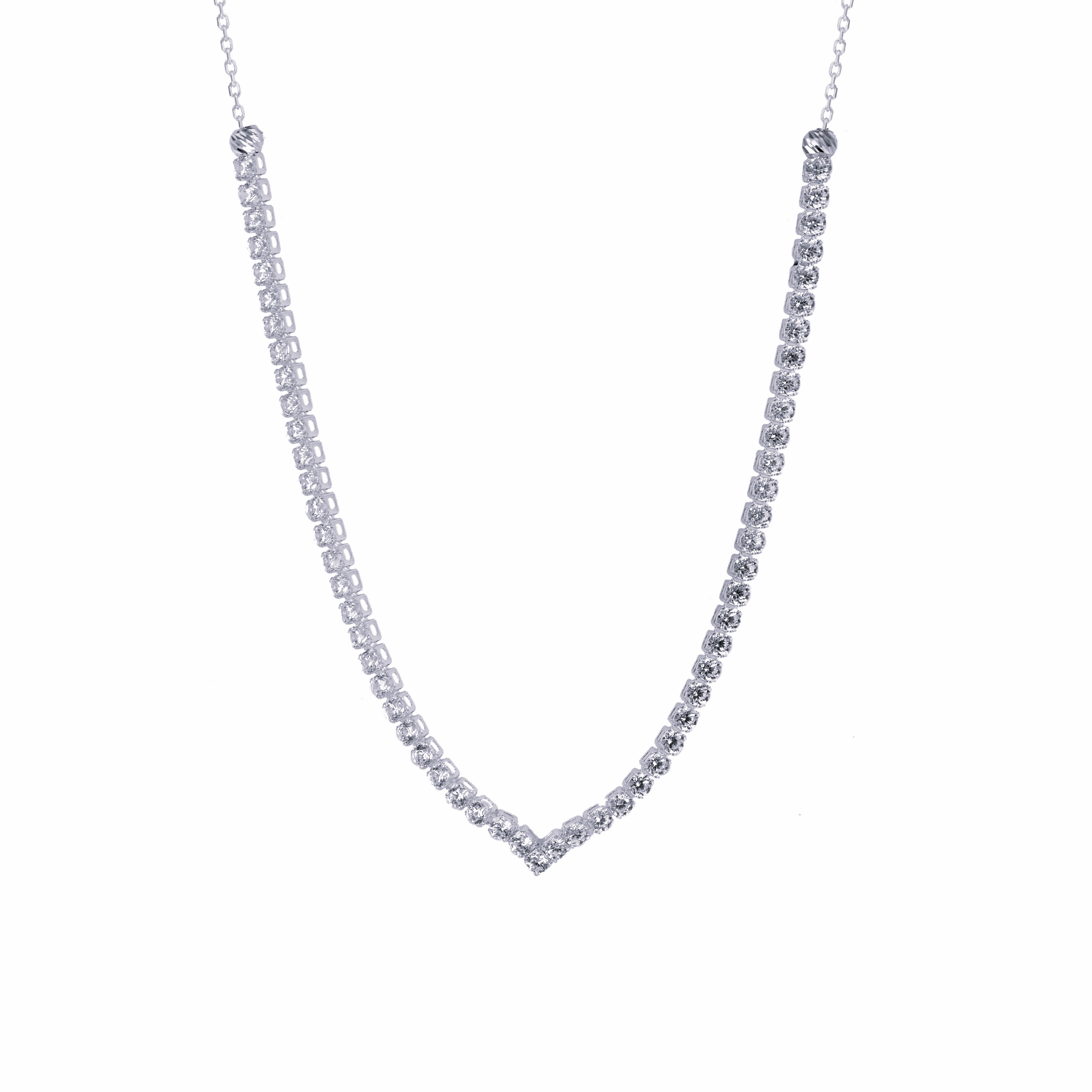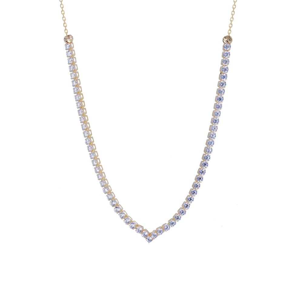 Κολιέ χρυσό 14 Καρατίων, με ιδιαίτερο μοντέρνο σχέδιο σε μονή σειρά από ζιργκόν Swarovski και στις άκρες μπίλιες διαμανταρισμένες.