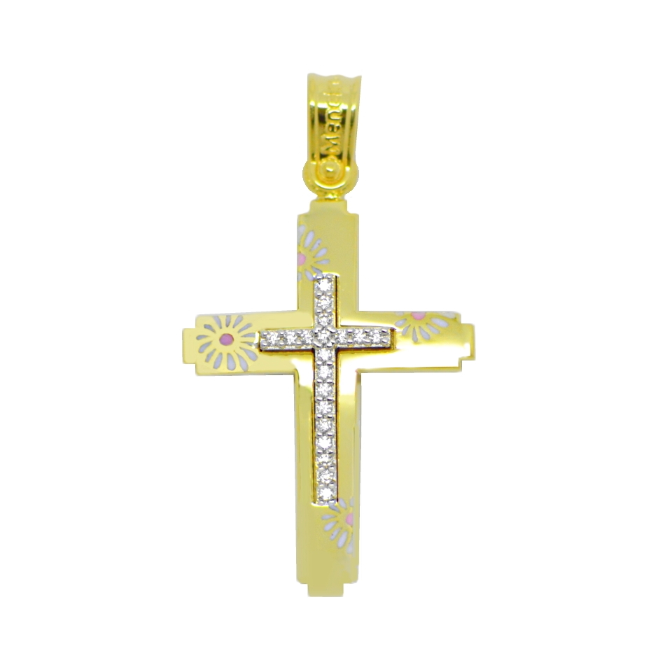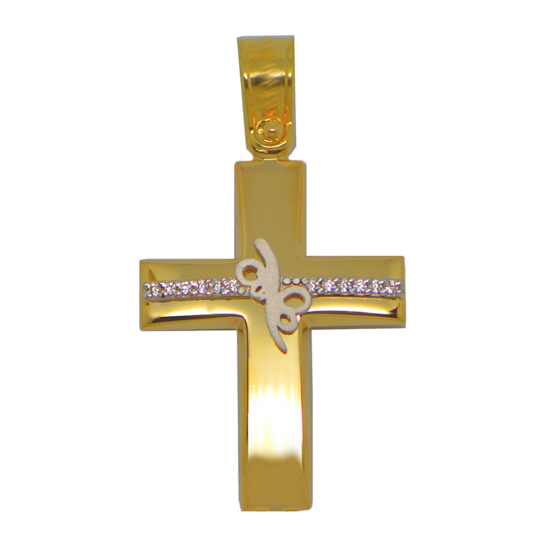 Χρυσός γυναικείος σταυρός 14 Καρατίων, γυναικείος, με λουστρέ φινίρισμα και λευκές πέτρες ζιργκόν Swarovski γύρω απο το κεντρικό σχέδιο.