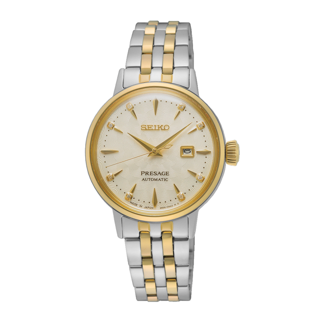 Η Seiko παρουσιάζει τις νέες petite προσθήκες στη συλλογή Presage Cocktail Time, εμπνευσμένες από την Ιαπωνική κουλτούρα των cocktail, από την περιοχή της Ginza του Τόκυο. Παραδοσιακά, το ‘Nomunication hour’ – ένας συνδυασμός της λέξης nomu (ποτό) και της λέξης communication (επικοινωνία), γίνεται μετά τις 5μ.μ. – δηλαδή την ώρα για Cocktail και συζήτηση. Η σειρά Presage Cocktail Time της Seiko, είναι εμπνευσμένη από αυτήν την Ιαπωνική παράδοση, όπου κάθε μοντέλο, έχει πάρει το όνομά του από ένα διαφορετικό Cocktail, παραγωγής του Hisashi Kishi, head bartender στο Star Bar. Σχεδιασμένο για να αντανακλά το φως, το καντράν του SRE010J1 έχει ανάγλυφο χρυσό μοτίβο και χρυσά στοιχεία, χρώμα εμπνευσμένο από το cocktail ‘White lady’. Διαθέτει οκτώ διαμάντια και αποτελείται από μπρασελέ 5 σειρών, που δημιουργήθηκε για να ενισχύσει τη λάμψη του. Διαθέτει λεπτή κάσα 30,3 χιλιοστών και λειτουργεί με τον in-house μηχανισμό 2R05.