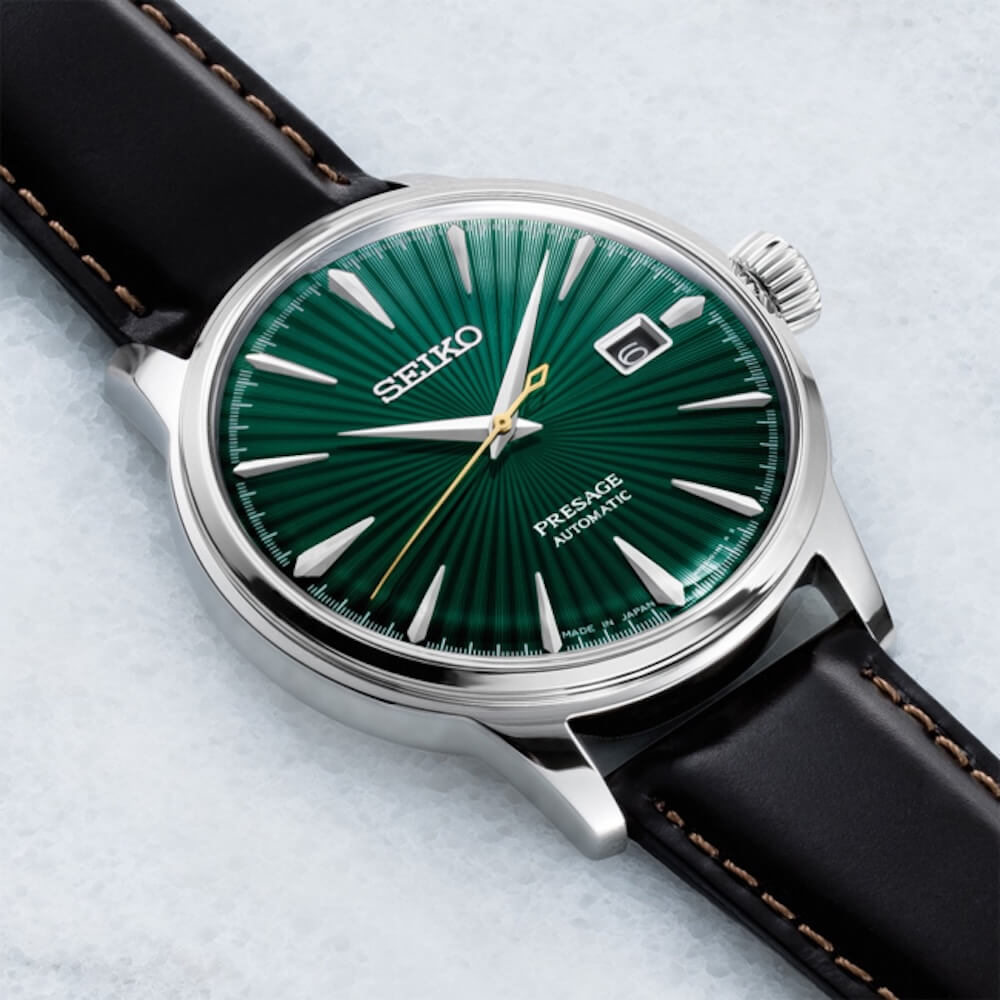 Η Seiko παρουσιάζει τη σειρά Presage Cocktail Time, εμπνευσμένη από την Ιαπωνική κουλτούρα δημιουργίας cocktail και τα φημισμένα ποτά του Skybar στο Τόκιο. Το συγκεκριμένο μοντέλο βασίζεται στο cocktail Mockingbird που χαρακτηρίζεται από την βαθιά απόχρωση πράσινου που αντανακλάται στο εντυπωσιακό καντράν.