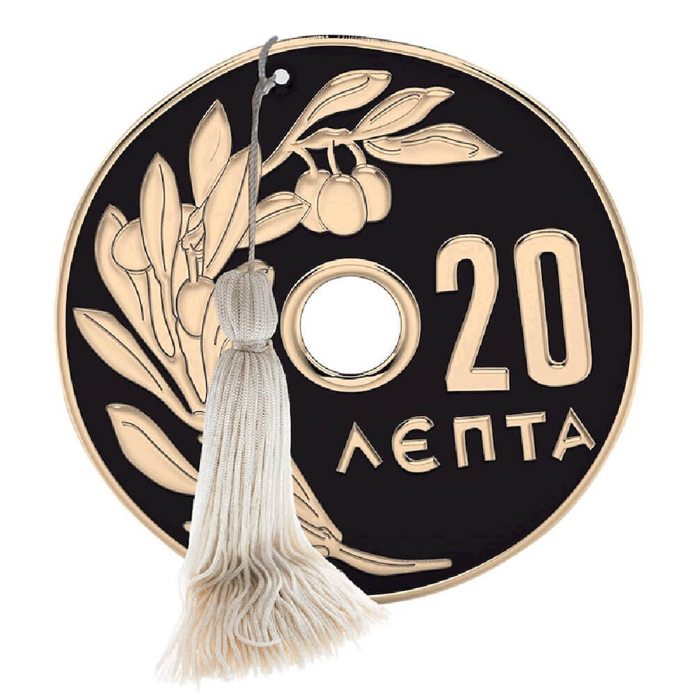 Γούρι επιτραπέζιο σε σχέδιο εικοσάρα (20 λεπτά της Δραχμής) και λευκή ξύλινη πλάτη.